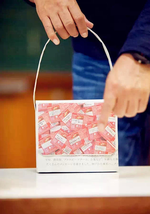 這名設(shè)計(jì)師叫梅原真,他的原始構(gòu)想是:用刊載了地方新聞的舊報(bào)紙做成的購物袋來包裝土特產(chǎn),許多當(dāng)?shù)氐娘L(fēng)土人情、地區(qū)特色,就能隨著客戶以及這些舊報(bào)紙購物袋,傳播出去。也許帶回到城市,顧客在回味這些美食之時(shí)會看認(rèn)真看一眼地方報(bào)紙上的新聞呢,也許對〝四萬十十和〞這個(gè)小山村,就有了印象呢。梅原真先生說。